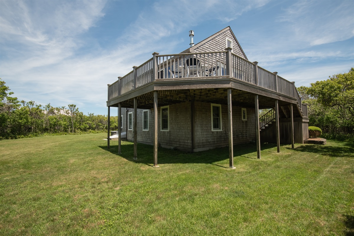 This home is a newly refurbished, clean and chic "upside down" beach house in Tom Nevers. 3 bedrooms plus a sleeping loft can accommodate up to 8 guests comfortably. Home features 3 full baths and a large wraparound deck, wonderful ocean views, spectacular sunsets, and an open floor plan. Short walk to ocean, 6 miles from town. Includes beach chairs, sand toys and beach tent. Also, towels and bed/bath linens are kept fresh and new for your comfort.